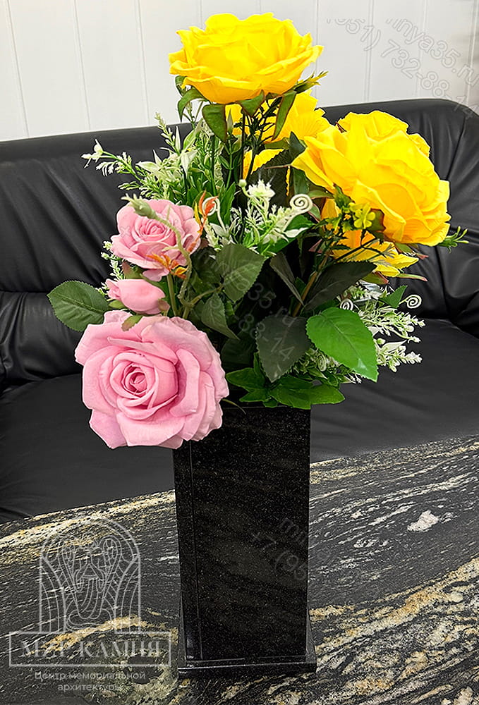 Гранитная ваза для захоронения — элемент вечного мемориала. Выполнена из натурального гранита с полированной поверхностью, подчёркивающей природную текстуру камня. Форма прямоугольная