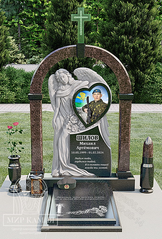 Мы используется сочетание чёрного гранита и коричневый гранит. Ангел с сердцем в сердце портрет цветной, фотокерамика по обжиговой технологии, навершие крест из толстого 10мм слоегог стекла. Мемориал воину, погибшему в ходе специальной военной операции. Этот памятник — современный символ скорби и памяти. Он посвящён российским военнослужащим, отдавшим жизнь в ходе СВО.