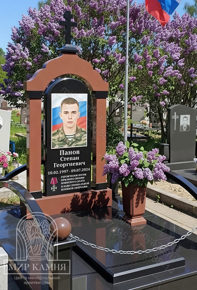 Величественный мемориал солдату СВО, устремленный ввысь, словно символ непоколебимой воли и жертвенного служения Отчизне, – это больше, чем просто памятник. Это ода мужеству, запечатленная в камне, свидетельство героизма, которое обязано вдохновлять грядущие поколения. Прямые, строгие линии мемориала подчеркивают его достоинство и значимость, а две мощные колонны, словно два столпа, поддерживают вечность подвига. Неповторимый акцент мемориалу придает цветной портрет героя, выполненный с поразительной реалистичностью. В каждом мазке, в каждой детали прослеживается живая искра мужества и любви к Родине. Лицо солдата, смотрящее на нас с вечной высоты, пробуждает в сердцах гордость и благодарность за мирное небо над головой.