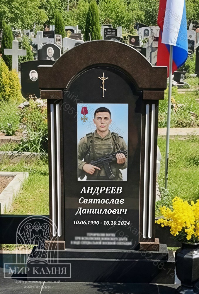 Под свинцовым небом, оборвалась молодая жизнь… Его имя, высеченное на холодном граните, – символ несбывшихся надежд и нереализованных мечтаний. Память о нем, как живой огонь, горит в сердцах близких и соотечественников.Арка из черного гранита, устремленная ввысь, словно портал в вечность, обрамлена теплым, коричневым камнем. Контраст цветов – отражение трагичной судьбы: молодость, полная энергии и света, внезапно столкнулась с холодной, безжалостной тьмой войны. Круглый верх арки – символ завершенности, законченного жизненного пути, прерванного безжалостным роком.На граните выгравированы слова скорби и благодарности. Каждое слово – эхо утраты, каждое – дань героизму. Здесь, у подножия памятника, льются слезы матерей, звучат тихие молитвы отцов, замирают детские сердца.
